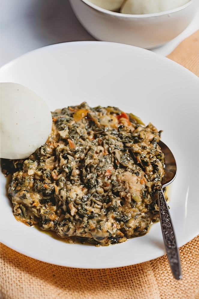 Erdnuss-Gemüseeintopf, serviert mit Fufu und Kuwanga (fermentierter Maniok).